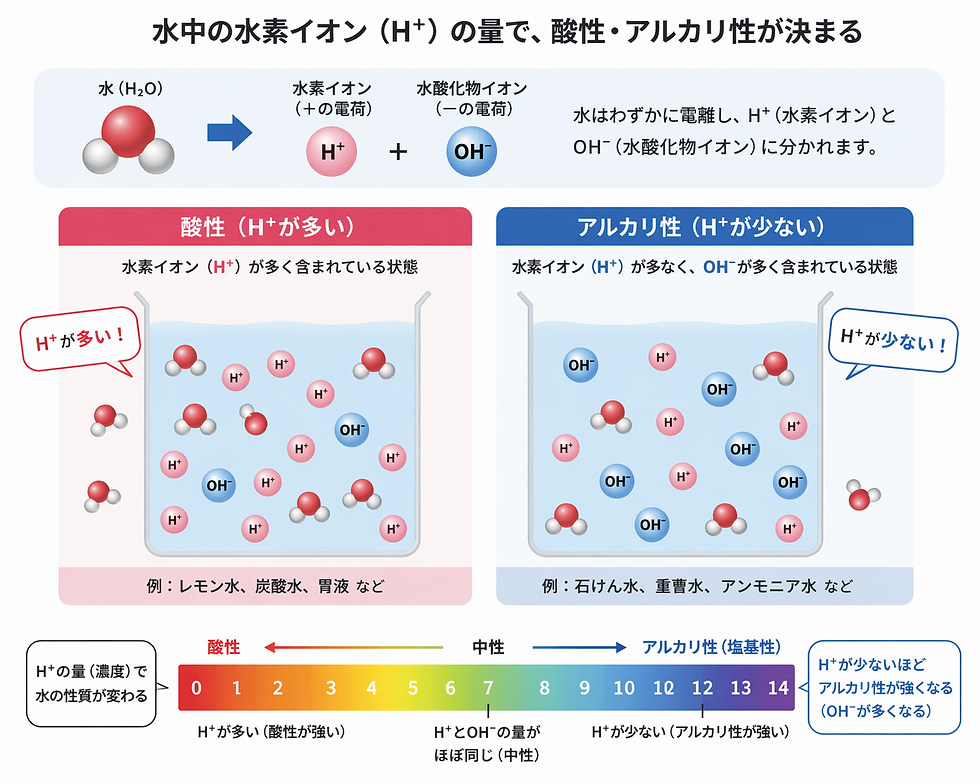 あくまで水素イオン(H⁺)は酸性かアルカリ性かを決めるための指標です。